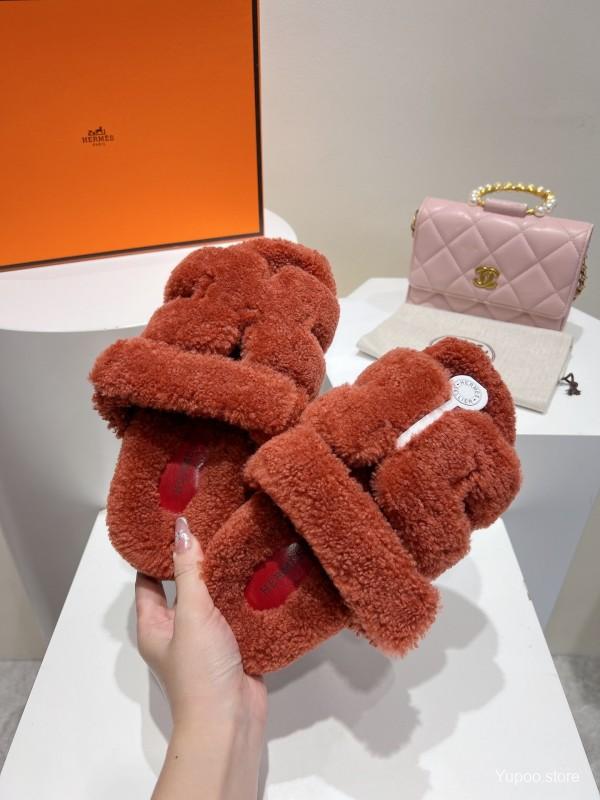 H Love Erjiu Full Wool Slippers with Slightly Curled Fur - LY00270